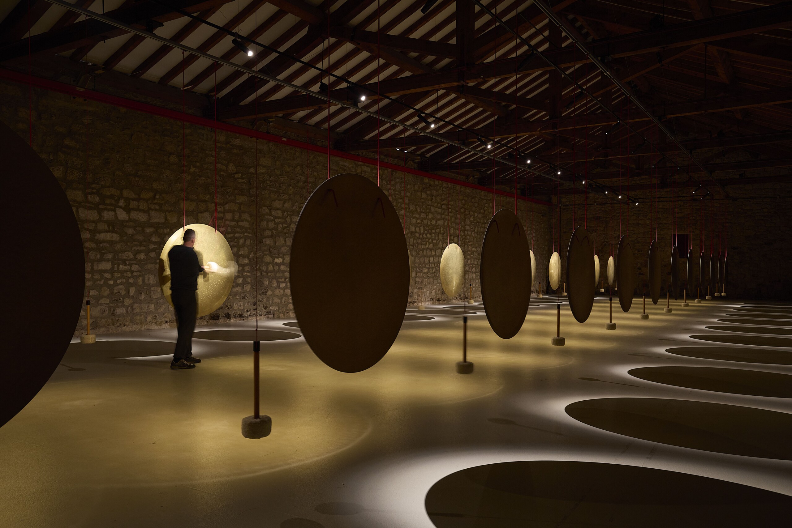 El visitante, maza en mano, acciona cada gong y genera una vibración única: un eco material y emocional que se prolonga en el espacio. Esa acción, aparentemente simple, activa un circuito poético y sensorial en el que cada persona se convierte en parte esencial de la obra. Como sucede con el vino, que no se entiende sin quien lo descorcha y lo interpreta, esta instalación solo cobra sentido con la presencia activa de quien la recorre.
